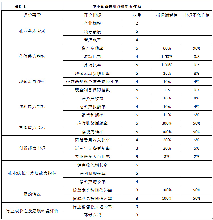 倉儲金融業(yè)務中,中小企業(yè)篩選的標準要根據國家對于中小型企業(yè)發(fā)展的指導思想,即“選擇重點,規(guī)范操作,總結經驗,翁不推進”與“支持發(fā)展與防范風險相結合;政府扶持與市場操作相結合;開展擔保與提高信用相結合”的三個原則要求,結合企業(yè)的實際情況對中小型企業(yè)進行篩選。倉儲金融業(yè)務是一項新業(yè)務,為有效規(guī)避風險,銀行對企業(yè)的審查相對嚴格,獲得批準者一般都是各項業(yè)務素質比較優(yōu)良的企業(yè)。比如廣東發(fā)展銀行在審貨時,一般選取行業(yè)市場占有率位于前三位的企業(yè),而且產品暢銷、價格穩(wěn)定、流通性好,同時也考慮企業(yè)的財務狀況、實力、品牌知名度等,目的是控制好信貸風險。與傳統(tǒng)信貸業(yè)務的審查不同,倉儲金融業(yè)務對所服務的周末和小型企業(yè)的審核更強調企業(yè)的成長性,這涉及該企業(yè)的還款來源。此外,經營管理團隊、產品及其技術含量、市場等也是審查的重點。對中小型企業(yè)的信用評價指標體系如表8-1所示,評價的要素包括企業(yè)基本要素、賠償能力指標、現金流量評價、盈利能力指標、營運能力指標、創(chuàng)新能力指標、企業(yè)成長與發(fā)展能力指標、履約情況、行業(yè)成長性與宏觀環(huán)境評價。