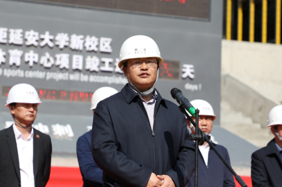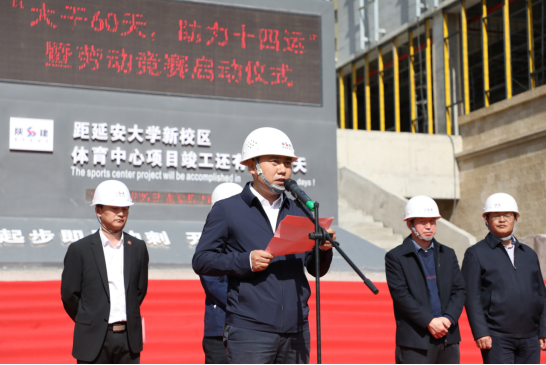 延安大學(xué)黨委委員、副校長楊偉宏致辭,他代表延安大學(xué)全體師生向疫情期間奮戰(zhàn)在一線的施工人員及陜建集團表示衷心感謝,對十三建公司承建的延大體育中心項目建設(shè)給予充分肯定。他指出,延安大學(xué)體育中心項目作為十四運重點建設(shè)項目,意義重大。當(dāng)前,項目建設(shè)進入60天倒計時,希望全體參建人員從延安精神中汲取力量,大力弘揚愛崗敬業(yè)、艱苦奮斗的勞模精神,進一步統(tǒng)一思想,提高認(rèn)識,鼓足干勁,用一流的速度,一流的品質(zhì),展現(xiàn)陜建集團的國企風(fēng)采和責(zé)任擔(dān)當(dāng),為第十四屆全運會順利召開貢獻(xiàn)力量。