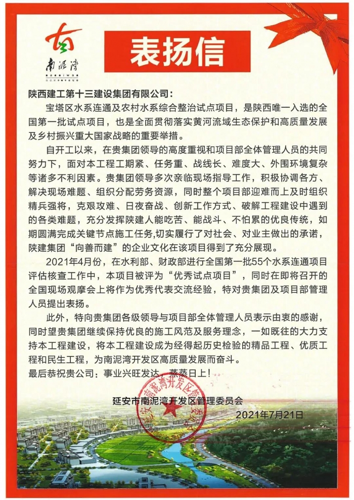 近日,陜建十三建集團(tuán)收到了來自南泥灣開發(fā)區(qū)管委會的表揚(yáng)信。信中,對集團(tuán)寶塔區(qū)水系連通及農(nóng)村水系綜合整治試點(diǎn)項(xiàng)目全體管理人員表示了高度贊揚(yáng)。