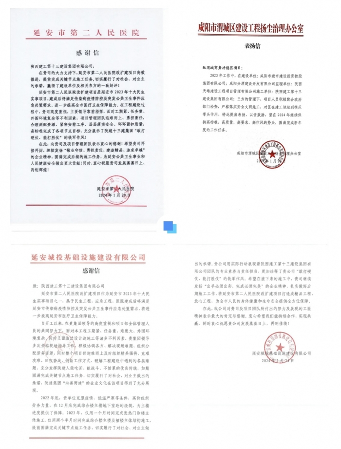 近日,集團第二工程公司施工的延安市第二人民醫(yī)院改擴建項目、咸陽渭城商務功能區(qū)項目收到建設單位發(fā)來的感謝信、表揚信,對集團在項目高質量建設中的傾情付出表示感謝,為項目團隊在施工過程中表現(xiàn)出的敬業(yè)精神表示贊揚。