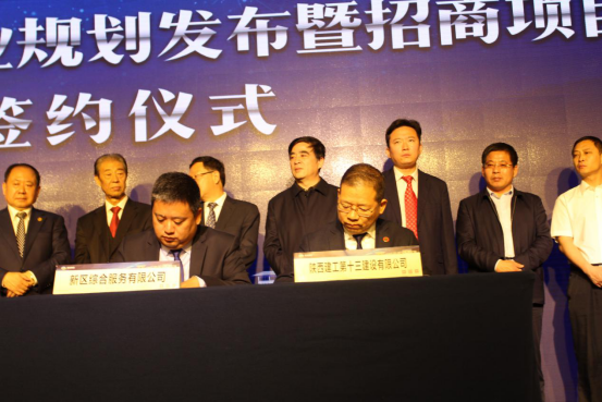 陜建十三建公司董事長卜國平(右)與新區(qū)綜合服務(wù)有限公司董事長王磊代表雙方簽約。